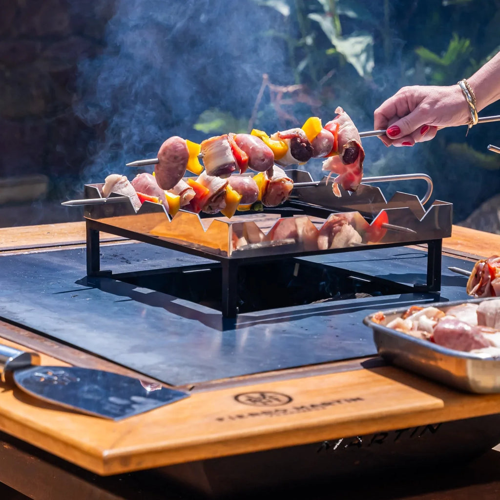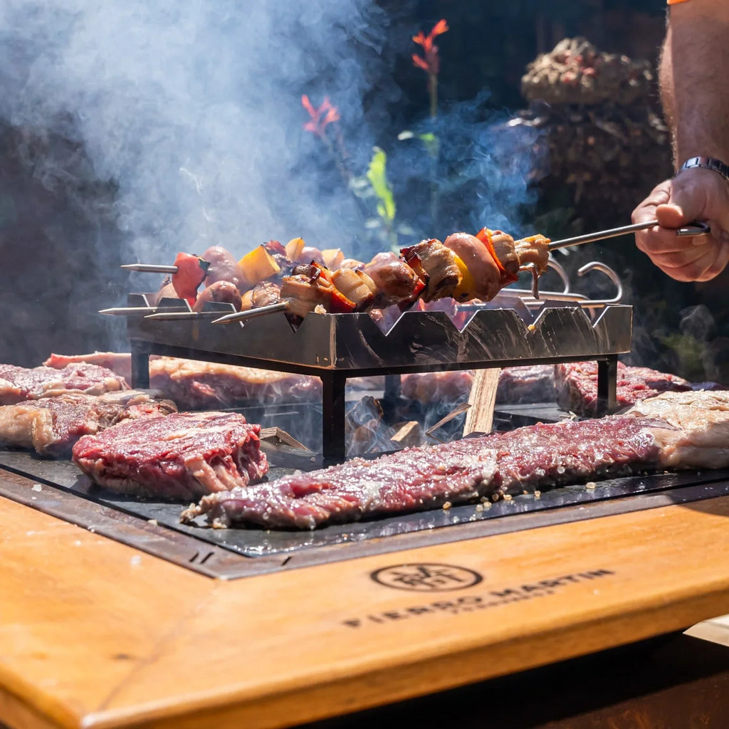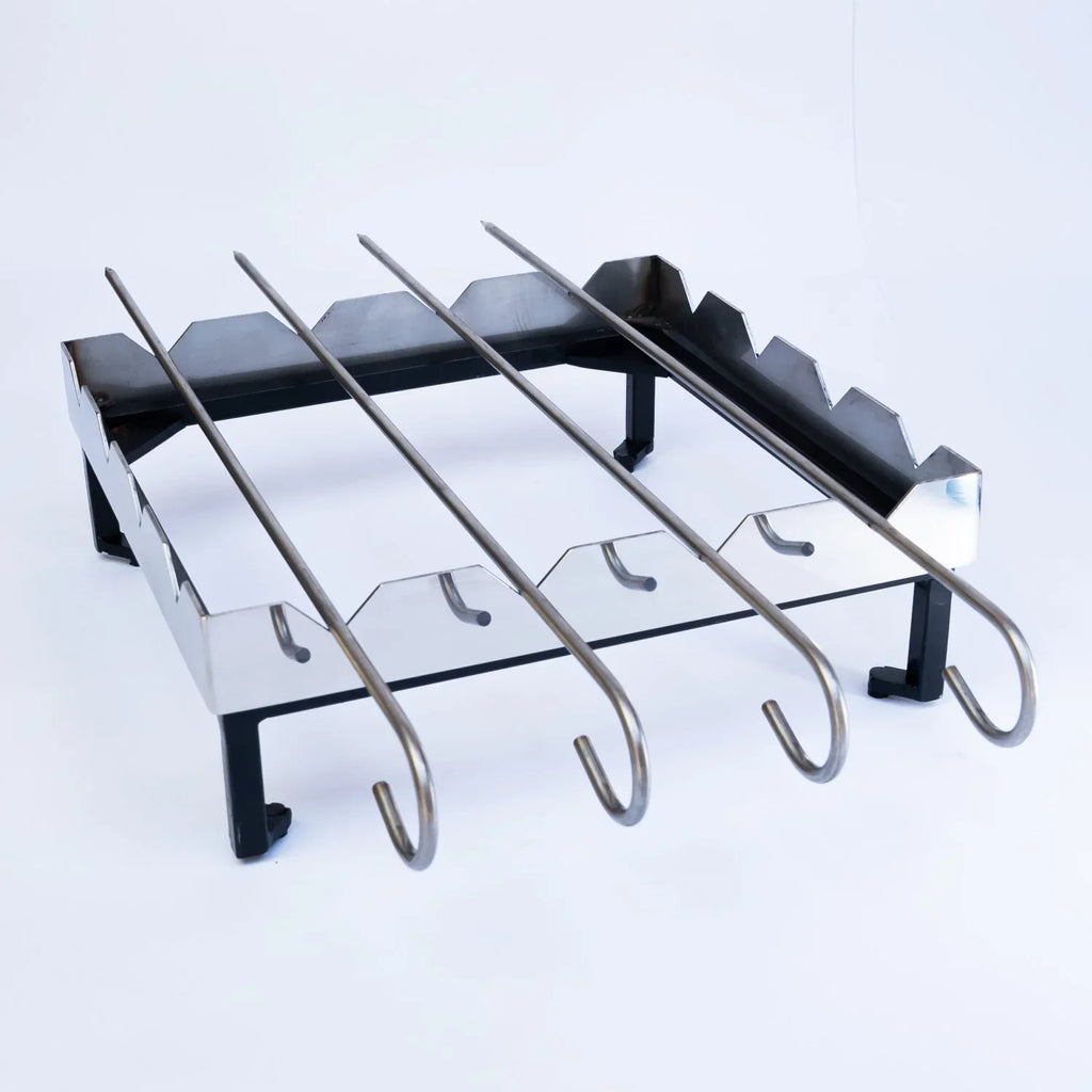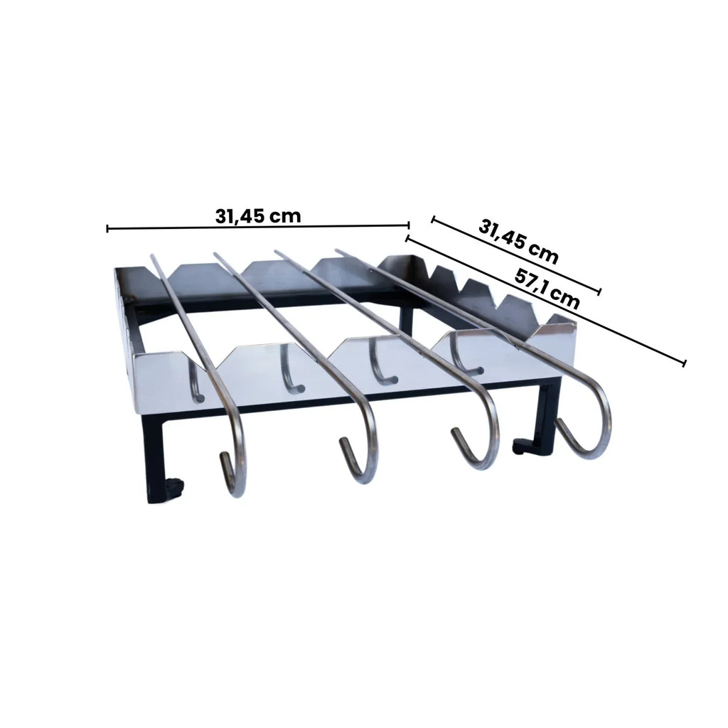 Com design inteligente e funcional, o suporte permite posicionar os espetos com estabilidade, facilitando o preparo uniforme das carnes e liberando as mãos para outros preparativos. Seja em churrasqueiras ou fogueiras, ele se adapta perfeitamente, otimizando sua experiência ao ar livre e elevando a qualidade do seu churrasco.