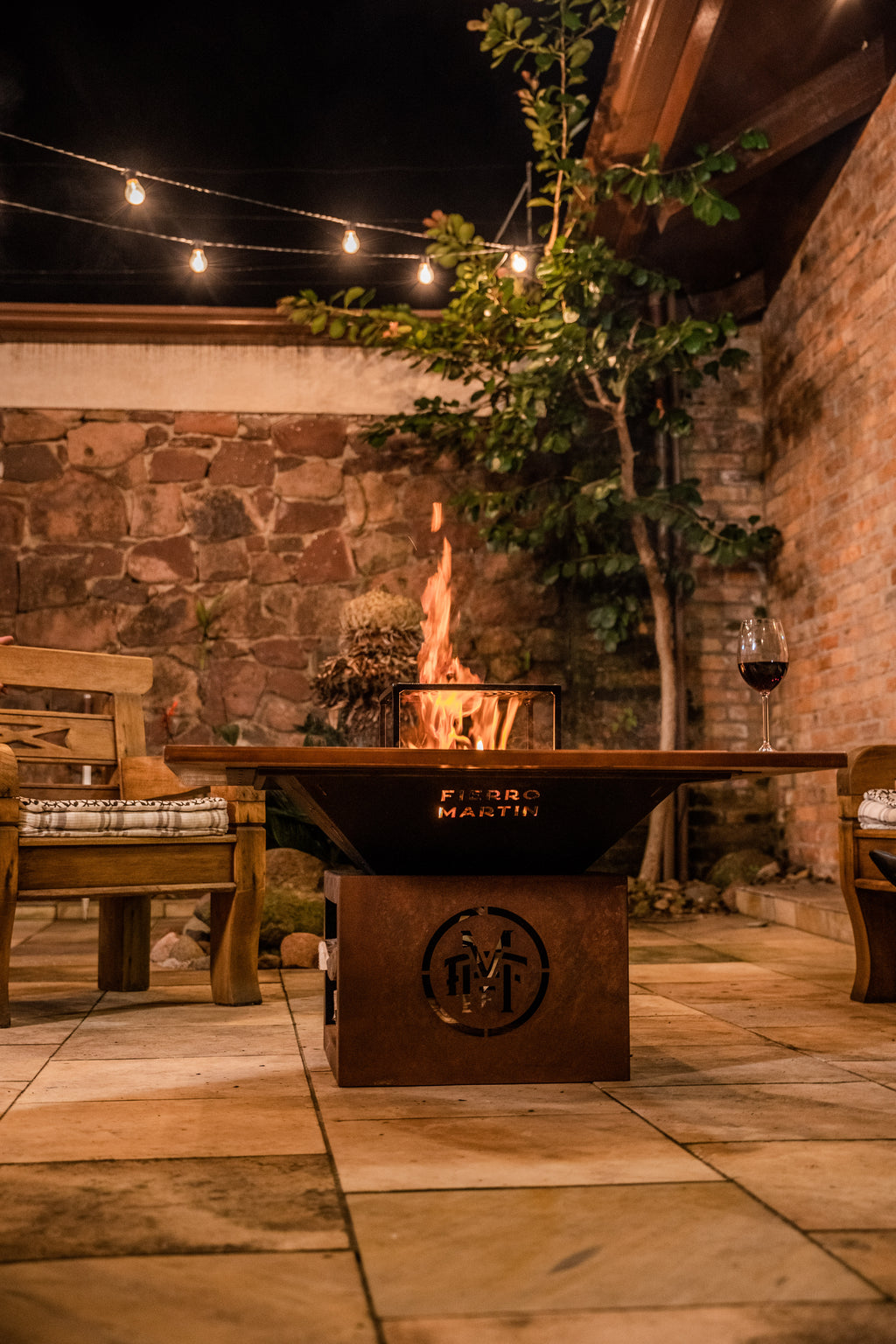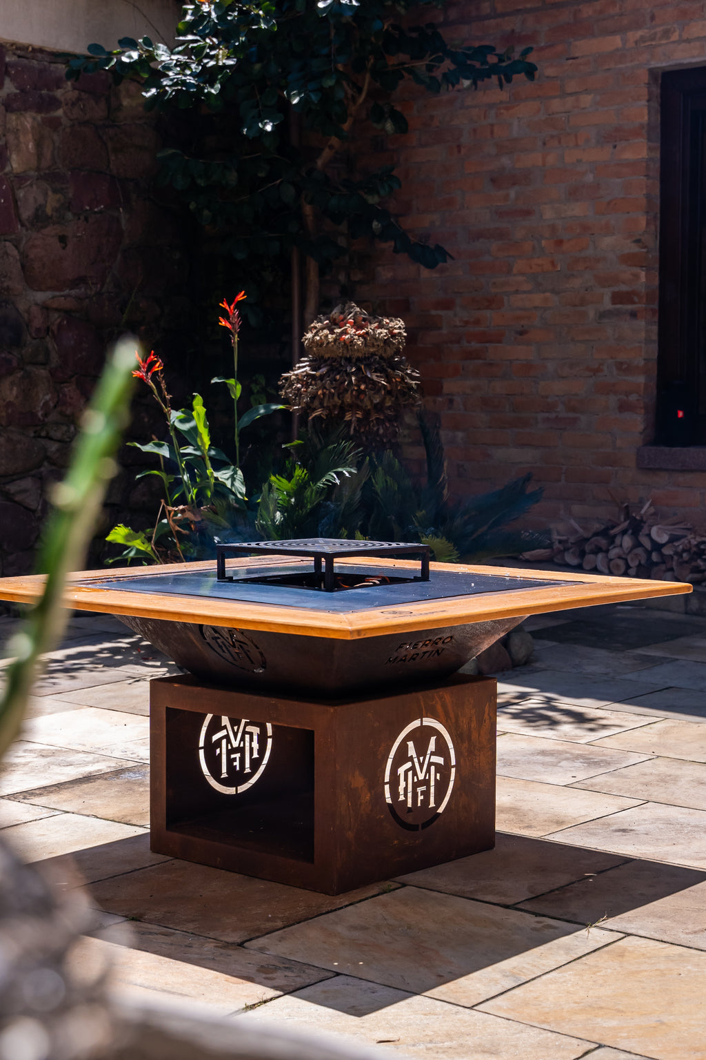 • A combinação entre o aço corten e os elementos metálicos cria um contraste sofisticado, reforçando a sensação de peça de design e utilitária.
