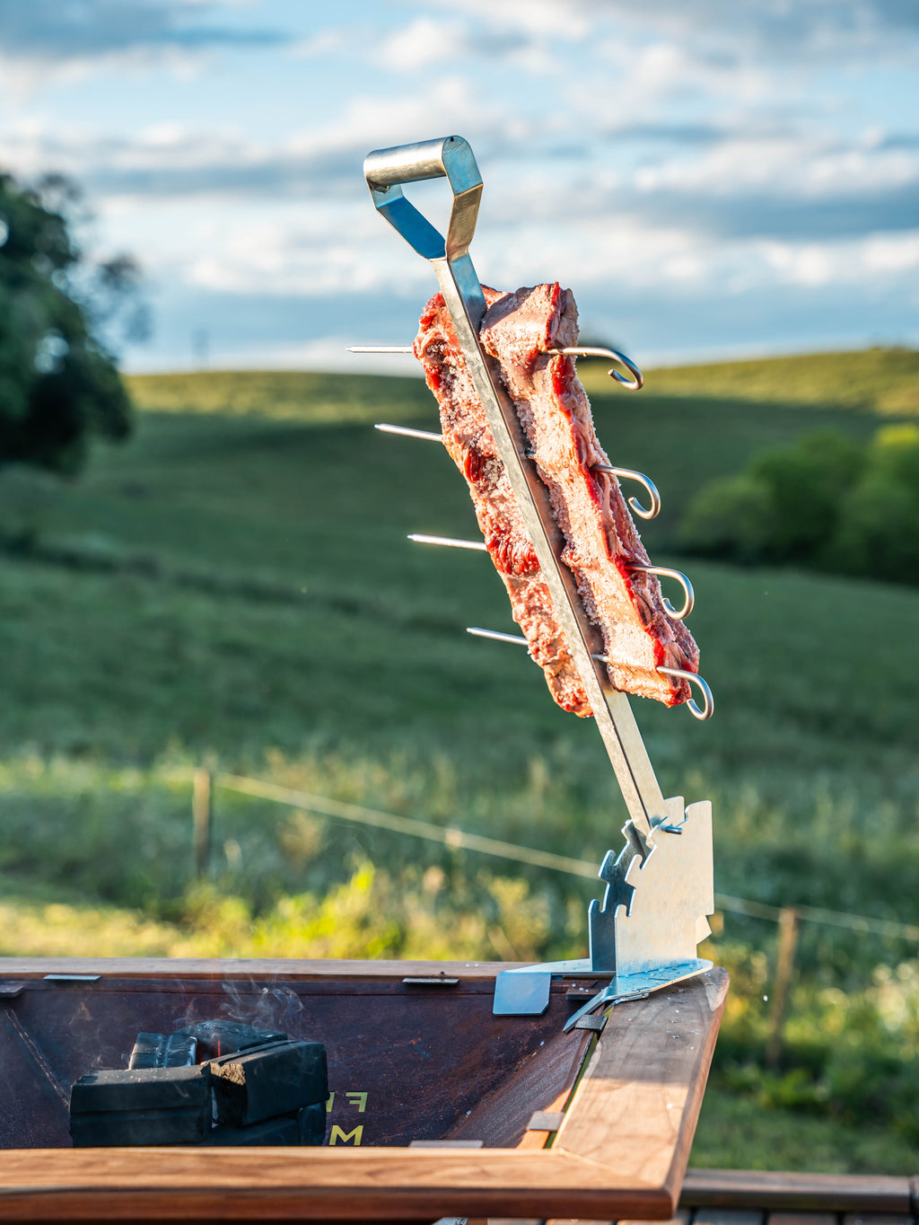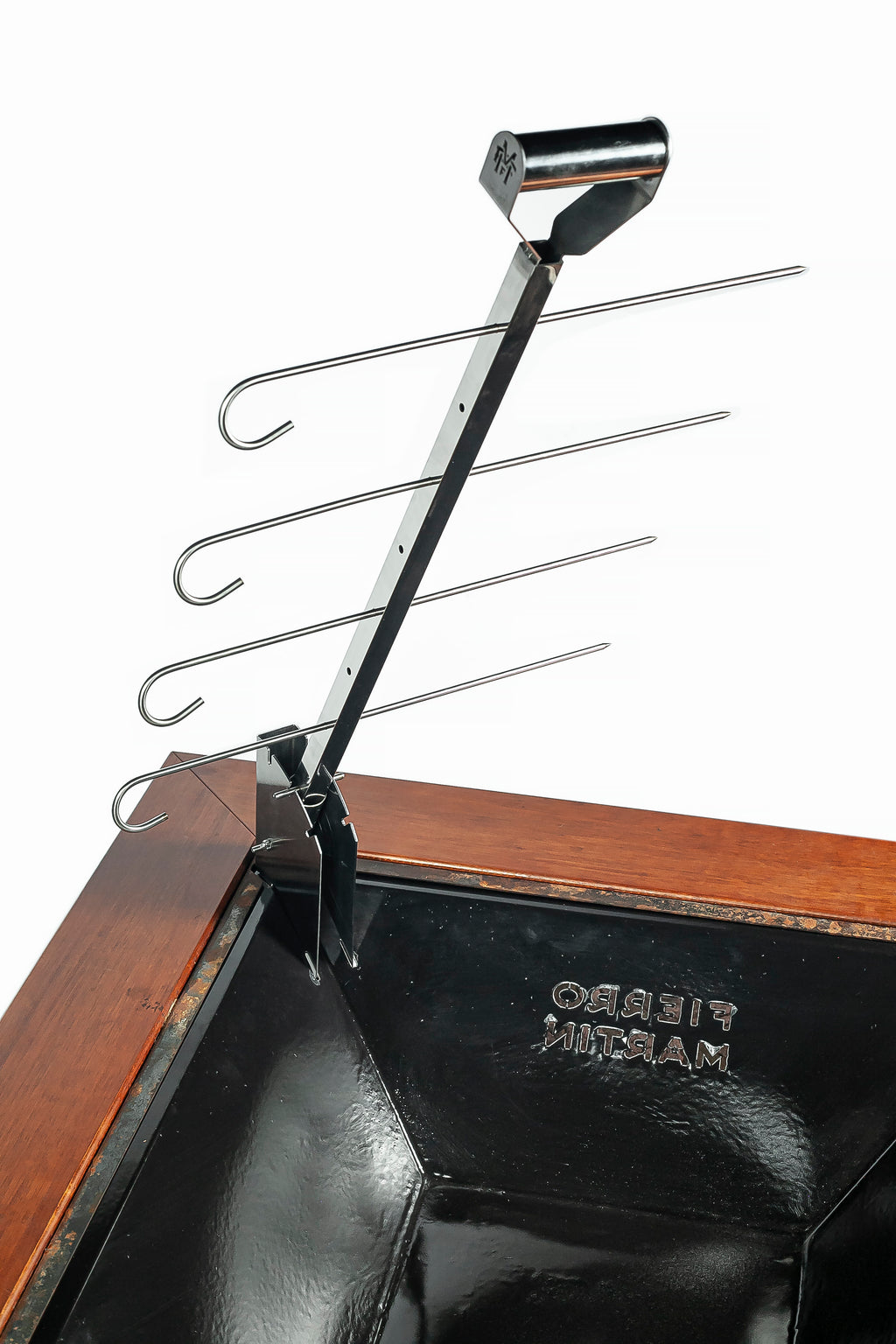 A catraca possibilita aproximar ou afastar os espetos da brasa com facilidade, garantindo assado uniforme e suculento.