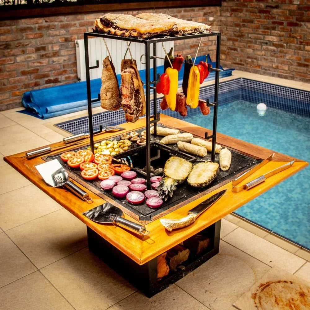 No topo, a área de preparo ampla possibilita múltiplos cortes, legumes e acompanhamentos simultâneos — perfeita para encontros grandes e momentos especiais.